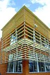Fasadene preges av lys, gråhvit tegl og trekledningen er i oljet lerk. På avstand blir vi utsatt for et synsbedrag, i det bygningene ser ut til å helle ut og frem. Dette utgjøres av liggende trespiler av kjerneved furu, som skråner utover og fungerer som solavskjerming. Skolens uttrykk ville vært mer konturløs og skilt seg mindre ut fra mengden, uten bruk av disse effektene.