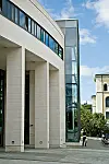 Det er et buetak over deler av sentralrommet, med tre krumme takelementer. Resten av taket har folietekking. Fasadene består av hvit kalkstein, samt partier med farget puss og ferdigpatinert båndtekking av sink. Balkongene er i lakkert stål. I uteområdene er det brukt betongheller, naturstein og plasstøpt betong med skiferinnslag som belegg.