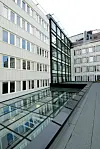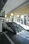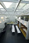 – Nybygget i Akersgata 66 er hjertet i prosjektet, der inngangspartiet og resepsjonsområdet sammen med det overhengende galleriet åpner bygget, forklarer arkitekt Guy Tchudi-Madsen om NAVs nye hovedkontor i Akersgata i Oslo. Bak den innbydende kantina er det i bakgården anlagt ny konferansedel, med et auditorium med 150 sitteplasser. Kantinedelen har en lys, vennlig atmosfære, med utsyn og utgang til en beplantet hage.