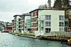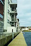Følelsen forsterkes av en lang flytebrygge som ligger foran de fire byggene.