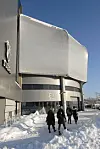 Det virker ikke slik, men taket på hallen er høyere enn næringsbygget. Den karakteristiske duken som er spent over taket, har en ren estetisk misjon og er et visuelt bidrag for å ta ned volumet. I tillegg fjerner den det rektangulære preget.