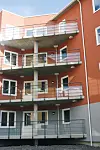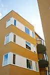 Bygningene er utformet med pussede flater i oker, terrakotta og lys grå farge. Heis/trapperom er kledd med panel beiset lys grå.