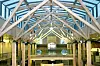 Glasstaket bæres av trekonstruksjonen, mens kontordekkene bæres av betongsøyler på sidene.