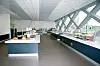 Berg sier at byggingen gikk greit. Den ene bruen ble sveist sammen utenfor bygget og heist på plass. Den andre ble sveist sammen inne i bygget og løftet på plass. Glasstaket kunne ikke monteres før bruene var på plass.