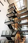 – Bygget er gitt en selvstendig estetikk i kontrast til eksisterende bygninger. Seks etasjer er et høyt bygg i Kongsberg-målestokk. Vi har derfor valgt å ikke føre øverste etasje helt ut til endene av fløyene og trappet ned volumet mot vei og tilstøtende arealer. For å dempe byggets høyde er 1. etasje og 6. etasje utført som lette glassfasader med en eksponert søylestruktur, opplyser Aase.