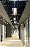 – I et bygg for informatikk visste vi tidlig at det ville bli trukket om veldig mange ledninger eller legges nye etter hvert som bygget brukes. Det er derfor vesentlig å ha god tilkomst til alle kabelbroer, og viktigere enn å ha tilkomst til ventilasjon eller rør. Kabelbroene lå opprinnelig i korridorsoner med en nettinghimling ved siden av og inn mot kontorer og i midtsoner som skjulte ventilasjonsteknikken. Som et besparende tiltak ble nettinghimlingen fjernet slik at all teknikk er synlig. På grunn av romakustikken må det være en del akustiske plater opp mot underside av betongdekke. Disse ble endret fra mineralullplater til treullsementplater som er synlige, og som dekker mer eller mindre av undersiden av betongdekket avhengig av romfunksjon og krav til romklang. Det går fra null til nesten 100 prosent treullsementplater, avhengig av romfunksjon, forklarer Aschehoug.
