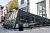 Hovedgrepene i komposisjonen er å løfte hele bygget på en sokkelkjerne i stein og betongsøyler, etablere en åpen glassfasade på bakkeninå med et regelmessig kontorbygg over i murpuss med dekorglassfelt.