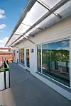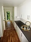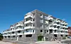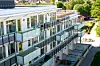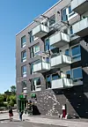 Bygget trapper ned mot sør fra fem til tre etasjer. Det igjen skaper store terrasser for de åtte treroms leilighetene. Men, som nevnt, roen og stillheten i uteoppholdsrommet mot vest er bemerkelsesverdig lite influert av den hastige trafikken i området rundt.