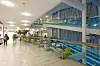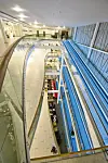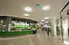 Senteret innvendig kjennetegnes av en enhetlig utforming med fliser og overflater. Den gitte etasjehøyden i den eldre delen er forsiktig kompensert med ramper i enkelte plan for å koble seg på den nye delen. − Over rullebåndene var det opprinnelig planlagt overlys. Jeg fryktet hvordan dette store rommet skulle fremstå da overlyset ble tatt ut av prosjektet. Men den store betongveggen med relieffmønster, lyset fra forretningene og glassrekkverket med blå lyssetting av rullebåndene, gjorde at jeg ble overrasket over fint det ble. Men det finnes andre løsninger på lyssettinger også som vi nå jobber med, sier Karlsen.