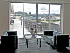 Solavskjerming i kontorblokken skjer med soldempende glass og automatisk styrte utvendige persienner. Helningsvinkelen på lamellene kan styres etter årstiden. På kalde vinterdager kan persiennene lukkes helt.
