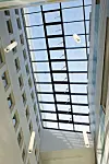 I takkonstruksjonen er det solreflekterende og selvrensende glass med ti lufteluker for kombinert røkventilasjon og komfortventilasjon . En værstasjon på taket forhindrer at lukene står åpne når det begynner å regne eller blir for mye vind, påpeker han.