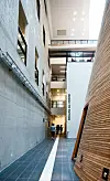 – Vi har prøvd å begrense materialbruken til forholdsvis få elementer som hver har sitt særpreg. De mest særpregete elementene i skolen er kokongen, øverste etasje med farget glass og det gjenreiste grønne bygget.