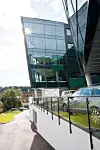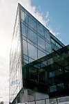 Bygget kjennetegnes av glassfasader og er svært godt eksponert mot trafikken sørover på E18. Begge fløyene skrår utover ca. 40 cm i hver etasje, og bæres av synlige skråstilte søyler.