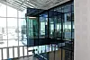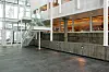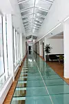 Nybygget er knyttet til gammel bygningsmasse med en glassgård. Også resten av nybyggets fasader er i glass.
