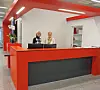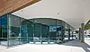 visningsbygg og et kontorbygg bundet sammen via et mellombygg i glass.