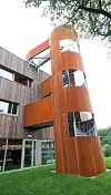 På baksiden, mot nord, ligger byggets utvendige rømningstrapp. Trappa i seg selv er standard, det er ved den ytre utformingen den skiller seg ut. I et rundt gridsystem er det montert buede plater som delvis omslutter formen.