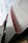 Bygget er tegnet av Tegn3 AS og har en tydelig karakteristisk buet fasade med vertikale vindusfelt med oransjefargede glassfelter.