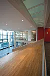 Flerbrukshallens plassering midt i bygget gir rom for en åpen glasshall med fellestorg og kantine, auditorier og toalettkjerne. Direkte inn fra skolens hovedatkomstområde i øst møtes man umiddelbart av en stor sittetribune/amfitrapp. Glassfasaden i øst går fra gulv til tak og gir et lett, lyst og transparent uttrykk. Det kommer de synlige, bærende elementene til gode.