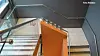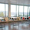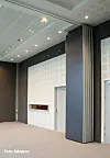 Det store møterommet skiller seg ut fra de øvrige arealene ikke bare i beliggenheten og utsikten. Arkitektene har valgt å la materialvalget avvike fra de andre rommene som de ansatte til daglig oppholder seg i. Møterommet med en takhøyde på takhøyde på 4,5 meter, har spesialdesignede tepper og skyvevegger for romdeling ved behov.