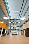Hovedbygget består av tre blokker, på tre og fire kontoretasjer, som er forbundet med en korridor i bakkant. Mellom blokkene er det anlagt et innvendig og et utvendig gårdsrom. I det innvendige gårdsrommet, umiddelbart innenfor resepsjonsområdet, ligger et glasstorg som inneholder kantine der over 1.000 mennesker skal kunne bespises samtidig. Fra hovedtrappa som vender ut i atriet er det svært godt utsyn.