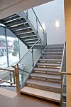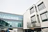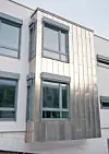 En direkte inngang til tilbygget ligger i den delvis åpne garasjekjelleren under bygget. Tilkoblingen til den eksisterende delen er gjort via en gangbro i to plan.