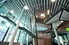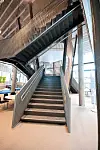 Hovedinngangen for kommunesenteret og biblioteket er i nordvest, og trekker altså veksler på lysinn-fallet fra gårdshagen. Det store innvendige rommet preges av en unik trappekonstruksjon. Den vokser fra nederste nivå, og de brannimpregnerte eikespilene sprer seg utover.