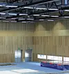 Inntil hovedinngangen ligger en uteterrasse med tilhørende innvendig kafeområde, og rom med dagslysbehov er plassert i denne delen av bygningen. Via hovedinngangen kommer man inn i en «tribunegate», hvor man har full oversikt over anlegget og lett tilgjengelighet til bygningens fasiliteter. Åpne gallerier gir innsyn til idrettsanleggene, garderobegang samt klubbrom-avdeling og binder anlegget sammen. Ved å legge hovedadkomst på det midtre nivået har bygningen fått en klar og god logistikk, og besøkende får umiddelbart en fin oversikt over anlegget. Gaten vil fungere som et sosialt møtested for utøvere og publikum og har ved større arrangement kapasitet til å håndtere store publikumsstrømmer og pause-aktiviteter. Gaten danner sammen med garderobeanlegget kjernen i anlegget, og er utført som en massiv konstruksjon med bærende søyler, vegger og dekke i betong. Kjernen vil også fungere som et magasinerende element med termiske egenskaper både i kalde og varme perioder.