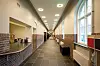 I den nye delen er det belegg, parkett eller slipt betong på gulvene. Veggene er i stor grad i frilagt støvbundet betong eller sparklet og malt betong som noen steder er kledd med eikespiler. Det er enten systemhimlinger eller faste himlinger med eikespiler. I den eksisterende delen er det belegg eller skifer på gulv, synlig tegl eller sparklet og malt tegl på veggene og systemhimlinger. Trapper og trappehus er bevart og har fått ny belysning.