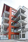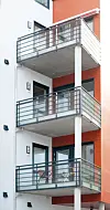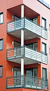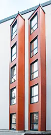 Bygget er tilnærmet rektangulært. Bærende konstruksjon er i plasstøpt betong. Trapper og balkonger er i betongelementer. Taket har svakt fall, har bæring av q-dekker med isolasjon oppå. Tekking er i takfolie. Fasadene består av hvit murpuss og oransje formica-plater. I leilighetene er det parkett på gulv og flislagte bad. Det ble praktisert rent bygg under oppføringen. Vinduene er i aluminiumskledd tre. Utvendig rekkverk er i glass og aluminium. Fasadematerialene har lang levetid og krever minimalt vedlikehold.