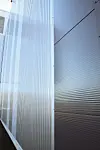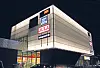 Polykarbonatet er på «den hvite boksen» brukt som et rent fasademateriale og bak materialet er det plassert lys som skaper en helt spesiell lyseffekt når det er mørkt ute.