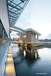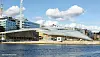 Museet har et tak formet som et senket seil og ligger helt i vannkanten.