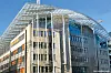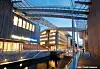 – For dette bygget fungerer glasstaket egentlig som en ekstra tekking, innskyter Godell. Bæringen for det tette taket er utført i limtre som ligger med en akseavstand på 3,6 meter. Limtrebjelkene danner en visuell forbindelse mellom byggene. Limtrebjelkene med toroidformen tilpasset geometrien, gjør at taket oppleves som felles for de tre byggene, forklarer Dvärsäter.