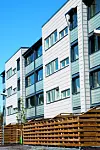 Tidligere hadde fasadene en prangende og dominerende rødfarge. Steniplatene som nå er på plass, har et vesentlig lettere uttrykk, og har sammen med ombyggingen av balkonger gjort mye for å få frem et langt mer moderne design.