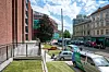Utomhus er de grå og usjarmerende betongmurene revet. I stedet kommer en «pocketpark» mot Pilestredet med hevet gressareal kantet av cortenstål og en rekke av trær. Utebenkene og betongstolene som kommer på plass, vil invitere til bruk. Det er også felt ned LED-belysning, og en bred granittrapp mot vest vil binde sammen tomtas to nivåer.