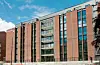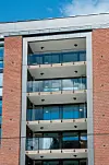 Den eksisterende teglfasaden er beholdt, men alle vinduer er byttet ut. Det er lagt inn vertikale glasslisser fra gulv til tak som sammen med de pågående utomhusarbeidene bidrar til en vesentlig karakterendring av hele bygget.