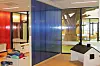 Utfordringen var et bredt og dypt fabrikkbygg med overlys. Når man så fikk et lokk over med etasjeskille, ville det bli veldig lite lys innerst i først etasje. Et atrium bringer lyset ned i første etasje og sprer det ut i rommet.