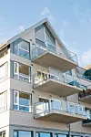 Derfor hadde kommunen ikke bare de ordinære kravene til møne- og gesimshøyder. Det var planlagt et flatt, tekket tak. Men det lå også kommunale føringer i takformen, der en saltaksløsning sett fra sjøen, var å foretrekke. Siden dette bygget nå får en unik eksponering mot havna er det skapt en identitet mot gamle, tradisjonsrike sjøboder. Saltakene gir også spennende løsninger for de øverste leilighetene, som har arealer over to plan. Den største har sågar en stor og usjenert takterrasse i tillegg til balkongen på ca. 12 kvm.