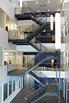 Det er lagt ekstra vekt på overflater og utforming i forbindelse med hovedinngangsparti mot syd. Det gylne bygningsvolumet bekledd med trefiner er løftet opp fra bakken og bidrar til visuelt å tydeliggjøre hovedadkomsten til bygget.