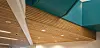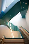 – Besøkende beveger seg oppover i bygget via en turkis trapp som snor seg på opp gjennom det trekantede trapperommet og ender i en stor terrasse som kan benyttes både til utstillinger og andre arrangementer. Utstillingssalene er uten dagslys etter ønske fra brukerne. Regulerbare og flyttbare spotlights montert på skinner festet i strekkmetallhimlingen gir stor frihet og fleksibilitet for ulik belysning av kunstverkene.