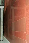 – Når jeg ser på alle fargeprøvene er jeg nesten overasket over at vi ikke ga opp, fordi det var så vanskelig å finne en god farge. Men til slutt ble vi meget fornøyd med det røde, gjennomfargede glasset som består av en tredjedel klart glass, en tredjedel Drammens-granitt og en tredjedel jernoksydfarget sement. Til sammen er det blitt en spennende overflate, som er slipt helt blank slik at den reflekterer rommene rundt. En edel betong, synes han.