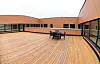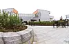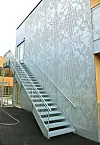 Utvendig har bygget et sprekt og forholdsvis ungt uttrykk, med en fasade av vekselvis bølgede og perforerte metallplater, med trefargede kompakt-laminatplater i nisjer og balkonger.