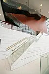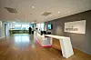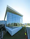 – Fasadene i innvendige bygningskroppen ligger innenfor den ytre glassfasaden. Fordi den da ikke blir utsatt for vær og vind er det mulig å tenke litt annerledes hva materialvalg angår. Her falt valget på Prodemaplater som gir det et uttrykk som et slags forfinet møbelskrin. Fasadene på bensinstasjonen er kledd med mørke, glansede Steniplater. Det foldede planet som danner den karakteristiske profilen, utgjør både tak, skråvegg i bakkant, og gulvet i kontordelen. Her er det valgt matte, hvite Steni-plater, forklarer Nielsen.