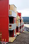 – Dette er et modulbygg, og det kan nok være delte meninger om i hvilken grad man skal la det komme til uttrykk i eksteriøret. Vi ser ikke det som noe minus og har heller ikke gjort noe forsøk på å skjule opprinnelsen. Vi har derimot utnyttet de fordelene som modulteknologien gir; modulene, som er 3,5 meter brede, er trukket ut eller skjøvet inn. Det gir variasjon i uttrykket, samtidig gir det skjerming for balkongene, som er plassert i de inntrukne partiene, sier Øistein Mangset i Felix Arkitekter.