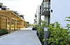 Utomhus på Saga Senter er umiddelbart noe av det mest påfallende med det spennende nabolaget. Gangveien mellom boligene går gjennom designerhager og treoverflater, og uteområdet har et grønt og hipt uttrykk.