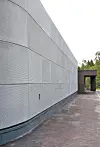 – To av hjørnene, de mot nordvest og mot sørøst, er avrundet og gir bygningsmassen en mykere form. Fasadene ved hovedinngang og ved inngangen til kiosken og ventilasjonsrommet har liggende, mørk panel. Hallen er utvendig kledd med strekkmetall-plater, også i det buede hjørnet ved den utvendige trappen som forbinder det øvre og det nedre nivået, sier Tollefsen.