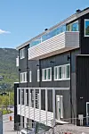 – Utfordringene med støyen fra trafikkbildet rundt har vært med på å legge føringer for arkitekturen. Alle leilighetene er lagt i to lameller på toppen i fjerde etasje. Soverommene er alle vendt ut mot det store, felles atriet. Det er også tatt hensyn til lydkrav i de leilighetene som vender mot sør. Brystningen på trepanelene er ca. 110 cm høy, med en glasskjerm på ca. 70 cm over. Vi argumenterte overfor myndighetene – uten å få gehør – for at det var formålstjenlig å legge kravet om lekeplass til utearealet i atriet. Det har nå fått en fin plassering på bakkeplan i vest, med en støyskjerm i vekselvis glass og tre rundt, forklarer Kjetil Bakken, arkitekt hos DBC Arkitektur.