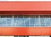 elementer, mens servicedelen har oransjelakkerte stålplater i fasaden. Det er to glassfasader i bakkant av halldelen og langsgående glassfasade i andre etasje i servicedelen. I halldelen er det overlys og røykventilasjon.