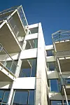 Hovedbærekonstruksjonen er i prefabrikkert betong. Fasaden mot sjøen har sementbaserte fasadeplater på en trestendervegg.
