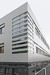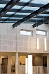 – I utformingen av fasaden har vi hatt et ønske om å speile den indre funksjonelle inndeling samt tilkjennegi et slektskap med dagens administrasjonsbygg som er utført i tegl. De to øverste kontoretasjene er kledt med plater i horisontalt format fra Cembrit og visuelt adskilt fra den murale sokkeletasje i Petersen tegl gjennom en sammenhengende glassfasade i første etasje. Denne sammenstillingen gir de to rene kontoretasjene en lettere karakte, noe som understrekes ved at volumet «svever» på søyler ved hovedinngangen. Petersen tegl er stedvis benyttet i interiøret for å gi fellesare-alene et sterkt visuelt slektskap, påpeker Traasdahl.