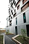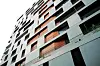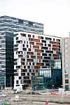En fasade med skyve-elementer der beboerne selv kan velge hvordan de vil skjerme uterommet bak elementene, skaper en levende fasade. OperaKvarterets smaleste bygg har fått utviklet sitt eget skreddersydde skyve-elementsystem.